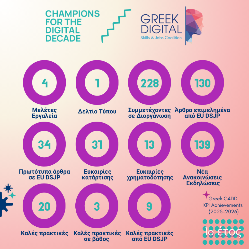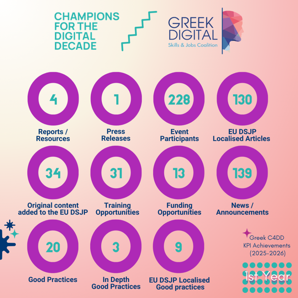 Το πέρασμα ενός έτους για το έργο Champions for the Digital Decade (C4DD) σηματοδοτεί ένα κρίσιμο ορόσημο στην προσπάθεια για την ενίσχυση των ψηφιακών δεξιοτήτων στο πλαίσιο της Ψηφιακής Δεκαετίας της Ευρώπης. Χρηματοδοτούμενο από το πρόγραμμα DIGITAL Europe, το έργο αυτό πέρασε τον πρώτο (1ο) χρόνο του ενισχύοντας τα εθνικά οικοσυστήματα ψηφιακών δεξιοτήτων σε ολόκληρη την ΕΕ. Ξεκίνησε τον Μάρτιο του 2025 και έχει διάρκεια 24 μήνες στοχεύοντας να συμβάλει στους στόχους της ψηφιακής δεκαετίας της Ευρώπης ως προς τον πυλώνα των ψηφιακών δεξιοτήτων.