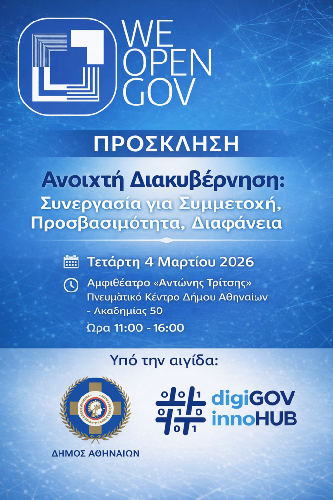 Στο Αμφιθέατρο «Αντώνης Τρίτσης» του Πνευματικού Κέντρου του Δήμου Αθηναίων (Ακαδημίας 50), θα πραγματοποιηθεί η φετινή εκδήλωση του WeOpenGov Forum την Τετάρτη 4 Μαρτίου 2026, με θέμα «Ανοιχτή Διακυβέρνηση: Συνεργασία για Συμμετοχή, Προσβασιμότητα και Διαφάνεια».