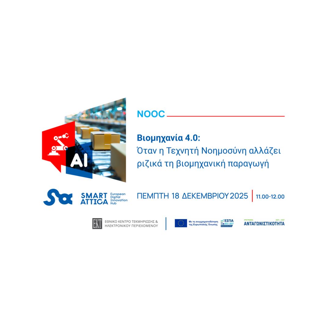 Το Εθνικό Κέντρο Τεκμηρίωσης & Ηλεκτρονικού Περιεχομένου (ΕΚΤ), στο πλαίσιο του Smart Attica EDIH, Ευρωπαϊκού Κόμβου Ψηφιακής Καινοτομίας, διοργανώνει διαδικτυακή εκδήλωση μέσω Zoom, με τίτλο «Βιομηχανία 4.0: Όταν η Τεχνητή Νοημοσύνη αλλάζει ριζικά τη βιομηχανική παραγωγή», την Πέμπτη 18 Δεκεμβρίου 2025 (ώρες 11.00-12.00).