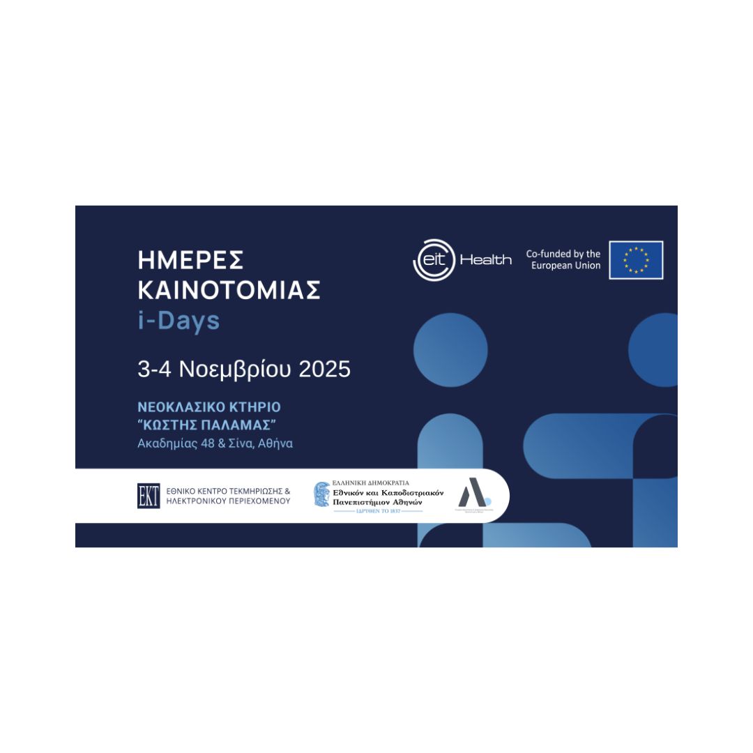 Για 7η συνεχή χρονιά, το Εθνικό Κέντρο Τεκμηρίωσης και Ηλεκτρονικού Περιεχομένου (ΕΚΤ), ως εκπρόσωπος του EIT Health για την Ελλάδα, διοργανώνει τις Ημέρες Καινοτομίας (i-Days) από τις 3 έως τις 4 Νοεμβρίου 2025 στο νεοκλασικό κτήριο “Κωστής Παλαμάς” στην Αθήνα (Ακαδημίας 48 και Σίνα), σε συνεργασία με το Εθνικό και Καποδιστριακό Πανεπιστήμιο Αθηνών (ΕΚΠΑ).