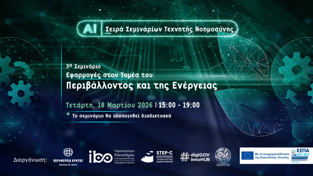 Η αξιοποίηση της Τεχνητής Νοημοσύνης (ΤΝ) στην αντιμετώπιση περιβαλλοντικών και ενεργειακών προκλήσεων βρίσκεται στο επίκεντρο του 3ου Εκπαιδευτικού Σεμιναρίου με τίτλο: «Εφαρμογές Τεχνητής Νοημοσύνης στον Τομέα του Περιβάλλοντος και της Ενέργειας», το οποίο θα πραγματοποιηθεί διαδικτυακά στις 18 Μαρτίου 2026, από τις 15:00 έως τις 19:00.